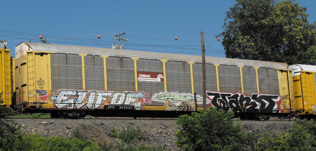 ETTX 908664 is seen on 33A at Wormleysburg PA on 7/9/11. Rack number is CR 8570 built 12-89 and rebuilt and repainted yellow 9-98.