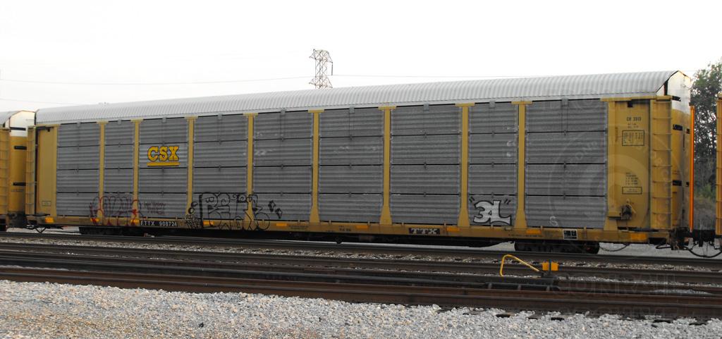 ETTX 908724 is seen in CSX paint on Q216-16 at Elsmere DE on 7/18/12. Rack number is CR 3513, built 7-86 & was rebuilt and repainted CSX 10-05. Rack was classed as a ML3E on CR.