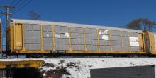 ETTX 909496 is seen in the consist of CSX Q217-17 at Newark, DE. Rack was built as CR 7218, a ML3N class rack in 4-89 and rebuilt, repainted and renumbered to a unknown NS rack number at a unknown date.