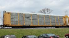 ETTX 909806 is seen in the consist of CSX Q217-02 at Newark, DE on 4/2/15. Rack was built as CR 8599, a ML3R class rack, in 12-89 and was rebuilt, repainted and renumbered to NS 33404 in 1-08. Rack is now classed FT642 by NS.