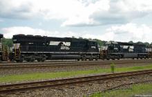 Ex-CR 5629 NS 6750 SD60I & ex-EL 3677 CR 6662 NS 1703 SD45-2 in the power consist of an eastbound manifest freight.