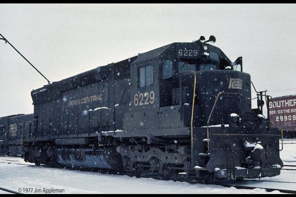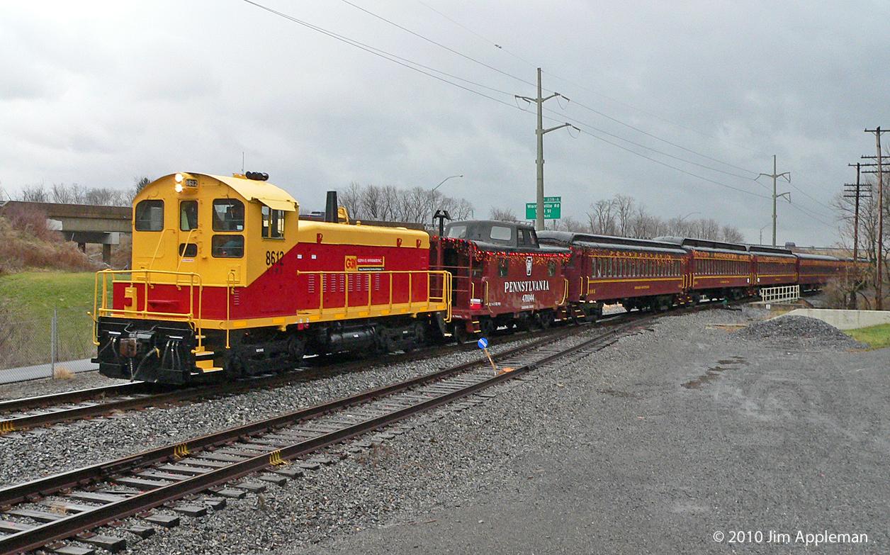 Williamsport/Lycoming CoC Polar Express with privately owned Penn Valley Railroad's fleet of restored vintage excursion equipment heads back to the Maynard Street Burger King parking lot, boarding location for the excursions. Excursions ran east with an LVRR SW9 on the east end to the Williamsport Regional Airport on LVRR, former CR, RDG track. HAWX 8612 leads going west with restored PRR 478044 N8 caboose coupled next in line.