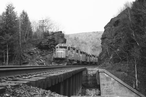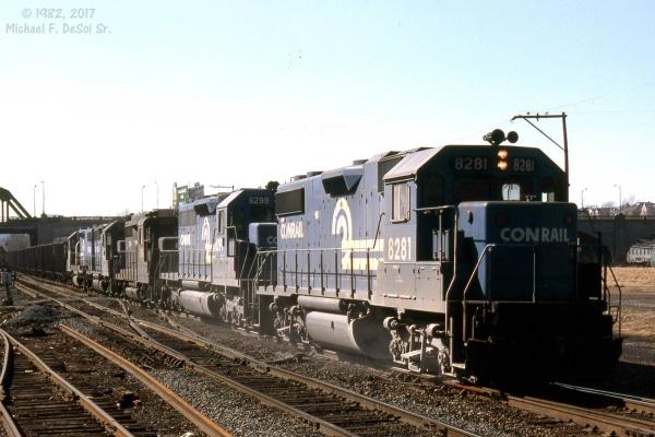 CR 8281 leads an eastbound coal train through what is now CP-88 in Bethlehem, PA. February 28, 1982