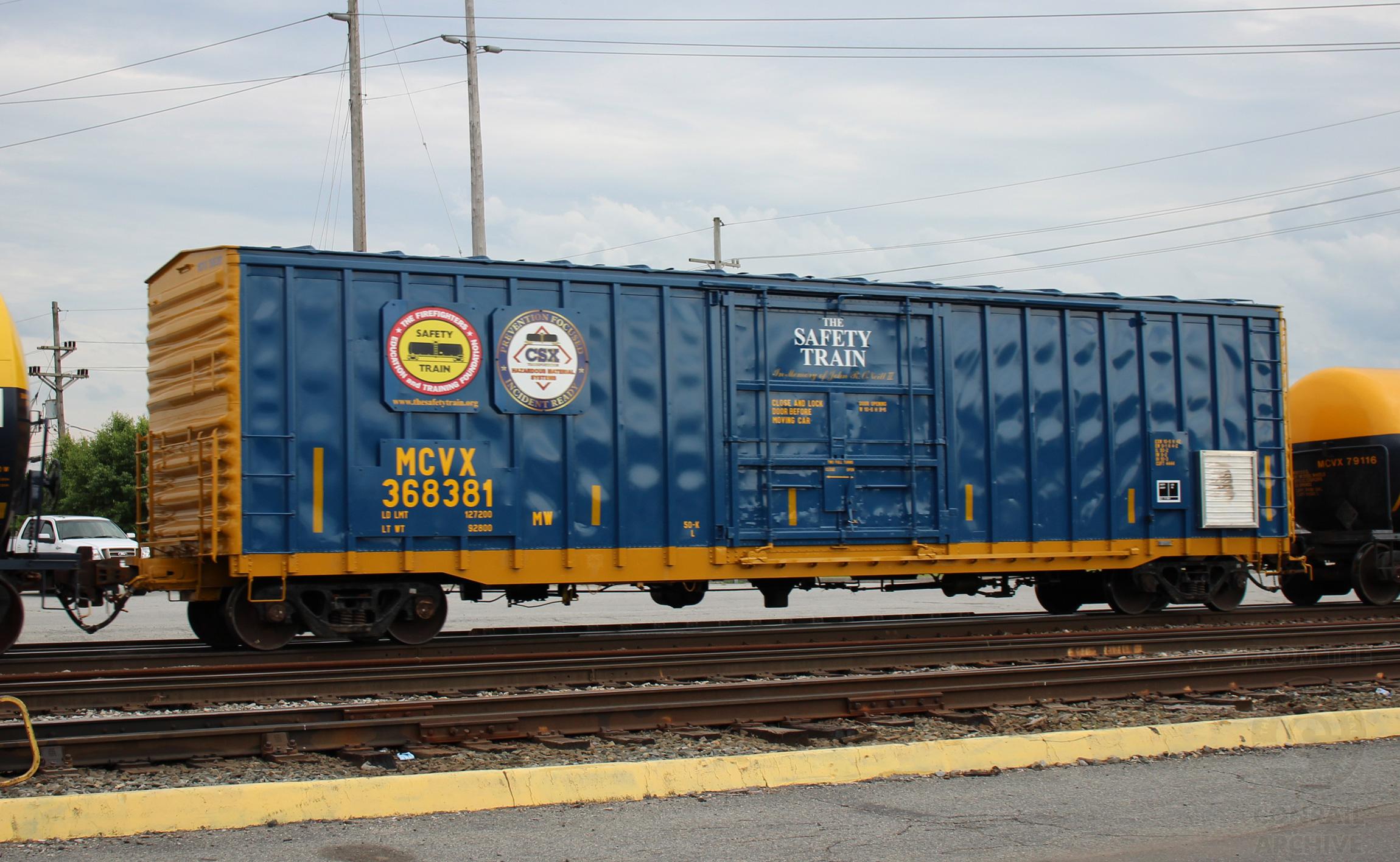 MCVX 368381 is seen in the consist of CSX Q438-25 at Elsmere, DE on 5/26/19. Car is ex CR 368381/CR 362144/PC 362144/PRR 118261 and was built 4-65.