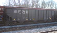 NS 144970 is seen on CSX rails at Elsmere, DE on 2/18/16. Car was re-bodied from CR 496024 in Nov of 2013 by Freight Car America in Roanoke, VA. CR 496024 was built 6-94 by HCS as a H2 class 4 bay hopper.