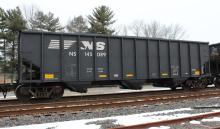 NS 145089 is seen at Deepwater, NJ on 3/1/15. Car was re-bodied from CR 496423 in Oct of 2013 by Freight Car America in Roanoke, VA. CR 496423 was built 8-94 by HCS as a H2 class 4 bay hopper. Car is stenciled being built 6-94, which is incorrect.