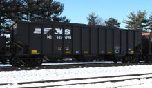 NS 145090 is seen at Deepwater, NJ on 12/12/13. Car was re-bodied from CR 496425 in Oct of 2013 by Freight Car America in Roanoke, VA. CR 496425 was built 8-94 by HCS as a H2 class 4 bay hopper. Car is stenciled as being built 6-94, which is incorrect.