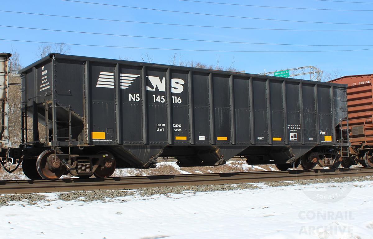 NS 145116 is seen in the consist of WB NS 34A at Wyomissing, PA on 2/24/15. Car was re-bodied from CR 497133 in Oct of 2013 by Freight Car America in Roanoke, VA. CR 497133 was built 11-94 by HCS as a H2 class 4 bay hopper.