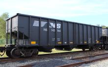 NS 145166 is seen at Deepwater, NJ on 9/23/14. Car was re-bodied from CR 497336 in Sept of 2013 by Freight Car America in Roanoke, VA. CR 497336 was built 12-94 by HCS as a H2 class 4 bay hopper.