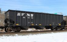 NS 145168 is seen in the consist of NS 507 at Wyomissing, PA on 2/24/15. Car was re-bodied from CR 496266 in Oct of 2013 by Freight Car America in Roanoke, VA. CR 496266 was built 8-94 by HCS as a H2 class 4 bay hopper.