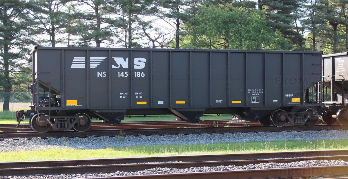 NS 145186 is seen at Deepwater, NJ on 6/1/14. Car was re-bodied from CR 496124 in Oct of 2013 by Freight Car America in Roanoke, VA. CR 496124 was built 7-94 by HCS as a H2 class 4 bay hopper.