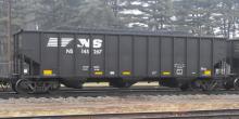 NS 145267 is seen at Deepwater, NJ on 1/10/14. Car was re-bodied from CR 496157 in June of 2013 by Freight Car America in Roanoke, VA. CR 496157 was built 7-94 by HCS as a H2 class 4 bay hopper.