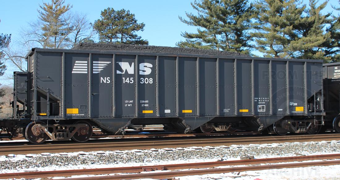 NS 145308 is seen at Deepwater, NJ on 1/4/15. Car was re-bodied from CR 497102 in July of 2013 by Freight Car America in Roanoke, VA. CR 497102 was built 11-94 by HCS as a H2 class 4 bay hopper.