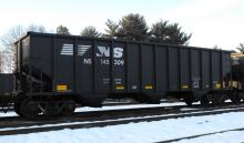NS 145309 is seen at Deepwater, NJ on 2/14/14. Car was re-bodied from CR 497321 in July of 2013 by Freight Car America in Roanoke, VA. CR 497321 was built 12-94 by HCS as a H2 class 4 bay hopper. Car is stenciled as being built 7-94, which is incorrect.