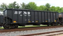 NS 145340 is seen at Deepwater, NJ on 6/22/14. Car was re-bodied from CR 496278 in July of 2013 by Freight Car America in Roanoke, VA. CR 496278 was built 8-94 by HCS as a H2 class 4 bay hopper.