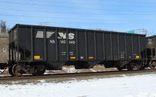 NS 145340 is seen in the consist of NS 507 at Wyomissing, PA on 2/24/15. Car was re-bodied from CR 496278 in July of 2013 by Freight Car America in Roanoke, VA. CR 496278 was built 8-94 by HCS as a H2 class 4 bay hopper.