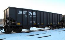 NS 145507 is seen at Deepwater, NJ on 2/14/14. Car was re-bodied from CR 496265 in Sept of 2013 by Freight Car America in Roanoke, VA. CR 496265 was built 8-94 by HCS as a H2 class 4 bay hopper. Car is stenciled as being built 6-94, which is incorrect.