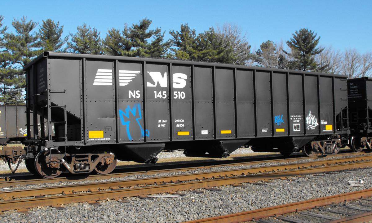 NS 145510 is seen at Deepwater, NJ on 3/24/14. Car was re-bodied from CR 496495 in Sept of 2013 by Freight Car America in Roanoke, VA. CR 496495 was built 9-94 by HCS as a H2 class 4 bay hopper. Car is stenciled as being built 6-94, which is incorrect.