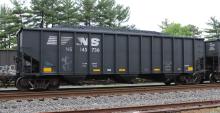NS 145736 is seen at Deepwater, NJ on 6/9/14. Car was re-bodied from CR 497533 in July of 2013 by Freight Car America in Roanoke, VA. CR 497533 was built 1-95 by HCS as a H2B class 4 bay hopper.
