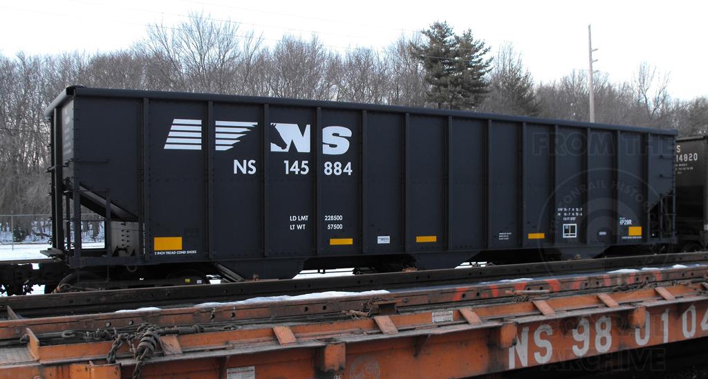 NS 145884 is seen at Deepwater, NJ on 2/14/14. Car was re-bodied from CR 497521 in Sept of 2013 by Freight Car America in Roanoke, VA. CR 497521 was built 1-95 by HCS as a H2 class 4 bay hopper. Car is missclassed as a HP29R as the former CR H2 class hoppers that were rebodied became HP28R on NS.