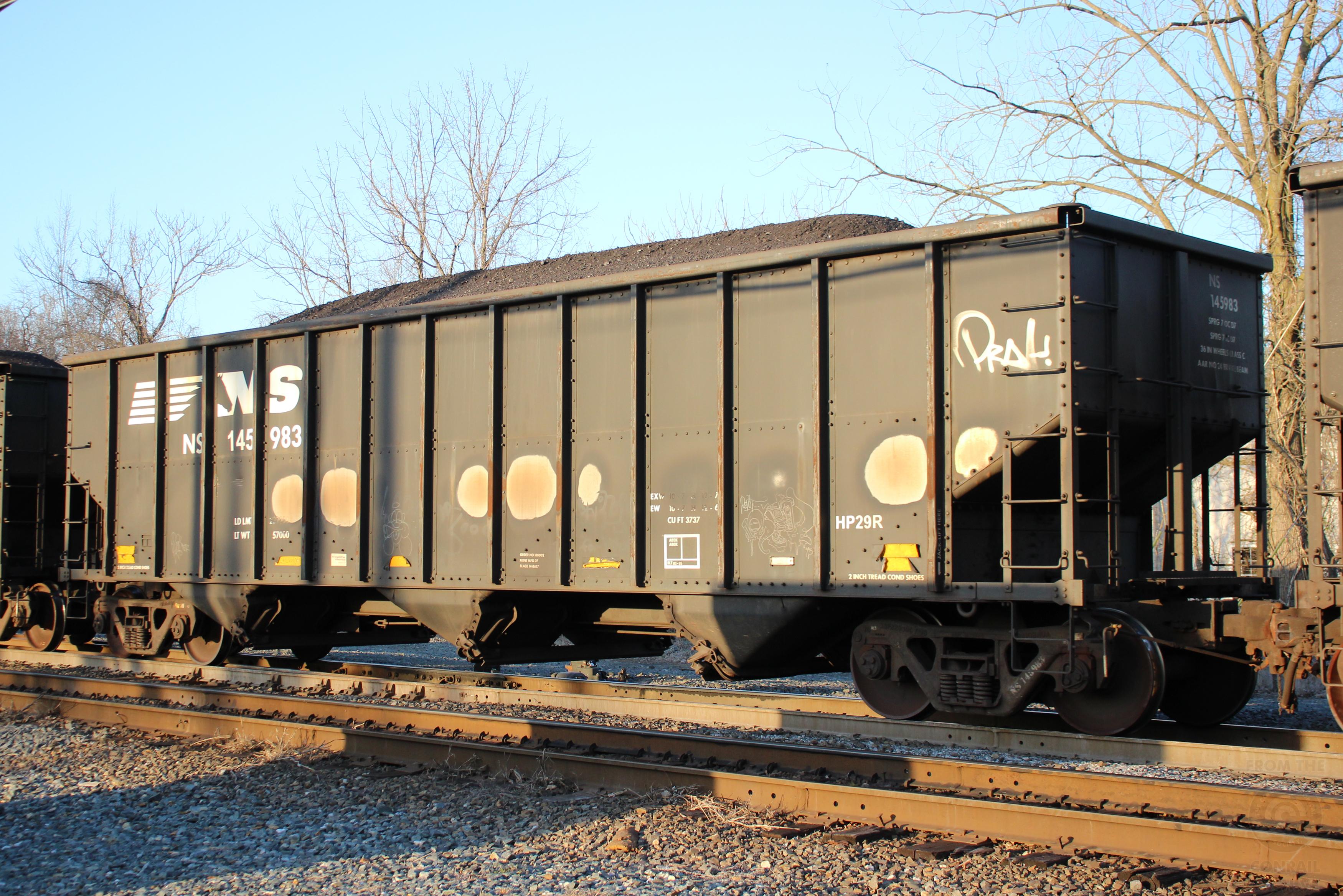 NS 145983 is seen in the consist of NS 592 at Perryville, MD on 3/20/21.Car is ex CR 497910, which was built as a CR H2Bclass hopper, in 3-95. Then was re-bodied and renumbered to NS 145983 in 11-13 by FCA at Roanoke, VA.