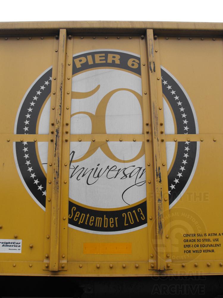 A view of the special 50th Anniversary logo is seen on NS 146313 at Deepwater, NJ on 1/10/14. Car was re-bodied from CR 498454 in Aug of 2013 by Freight Car America in Roanoke, VA. CR 498454 was built 4-98 by HCS as a H2C class 4 bay hopper.