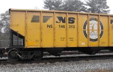 A view of the left end of the left side of NS 146313 is seen at Deepwater, NJ on 1/10/14. Car was re-bodied from CR 498454 in Aug of 2013 by Freight Car America in Roanoke, VA. CR 498454 was built 4-98 by HCS as a H2C class 4 bay hopper.