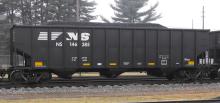 NS 146385 is seen at Deepwater, NJ on 1/10/14. Car was re-bodied from CR 498563 in July of 2013 by Freight Car America in Roanoke, VA. CR 498563 was built 5-98 by HCS as a H2C class 4 bay hopper.