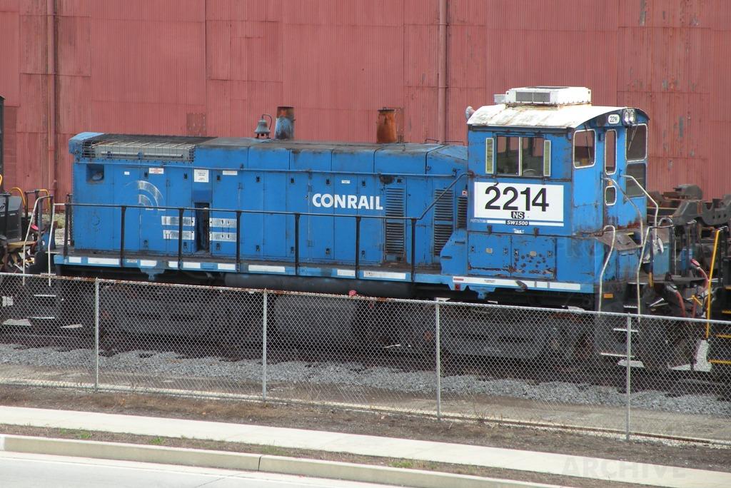 NS SW1500 2214 (ex CR 9532) is seen resting in a line of 5 SW1500s at Altoona's Juniata Shops on Sat, October 3, 2009 around 1:30pm. Note, this locomotive has bBoomberg trucks and appears to be marked "Pottstown" below the cab window.