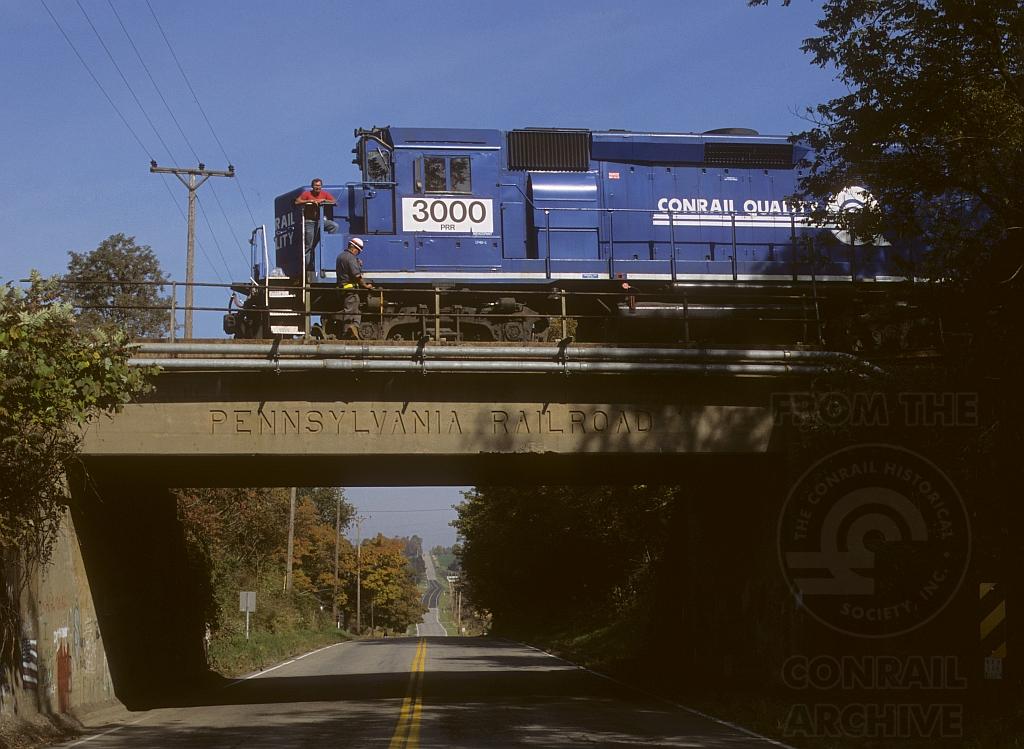 Talk about history all in one shot. Here we have a bridge with Pennsylvania Railroad cast in the concrete on the former PRR/PC/CR now NS Ft Wayne Line. Up above a work train waits, it's crew enjoying a nice Fall day. Norfolk Southern ("PRR") GP40-2 #3000 still wears it's CRQ blue, and still shows it's Reading Lines heritage with those drip strips on the cab roof and the smaller fuel tank. Let's see now, a NS/CR/RDG unit on a NS/CR/PC/PRR bridge.....click, history recorded.