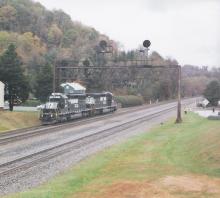 Former Conrail 6409 and 6432(NS 3357 and 3372) lite helpers work downgrade at Summerhill, PA on Oct. 25, 2008