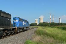 A loaded PPLX coal train is about to its destination of PPL's Montour Power Plant. The twin-flue stack for scrubber operation is under construction.