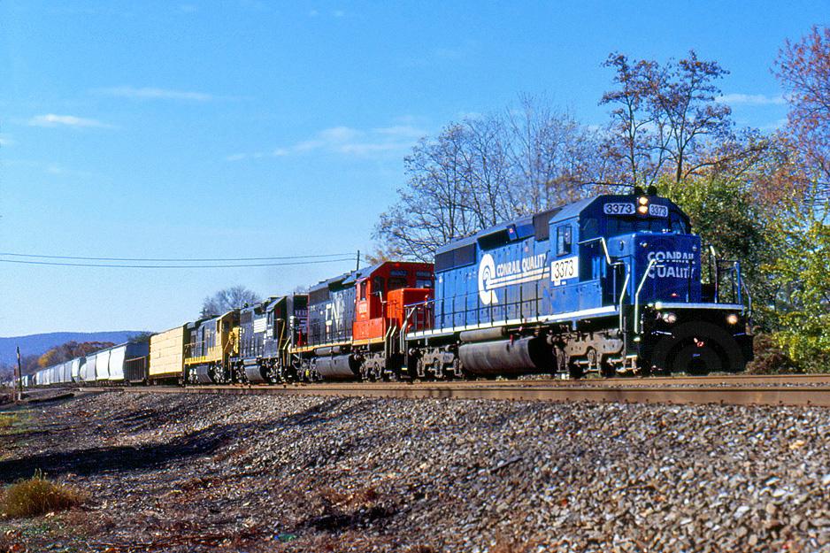 NS 3373 (ex-CR 6434) is on the point of an eastbound freight at Cove, Pa 9/1999