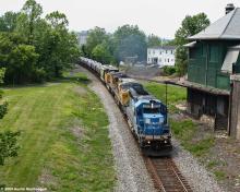 NS 3380 still wears Conrail blue nearly ten years after the split as it leads eastbound loaded ethanol train 68Q past the old CNJ/DLW station in Phillipsburg, NJ on May 23, 2009. Trailing in the consist is a pair of Union Pacific AC4400CW's. The 3380 was added to the front of this train at Rockport Yard in Cleveland to provide cab signals for the trip on the ex-PRR territory in Ohio and PA.