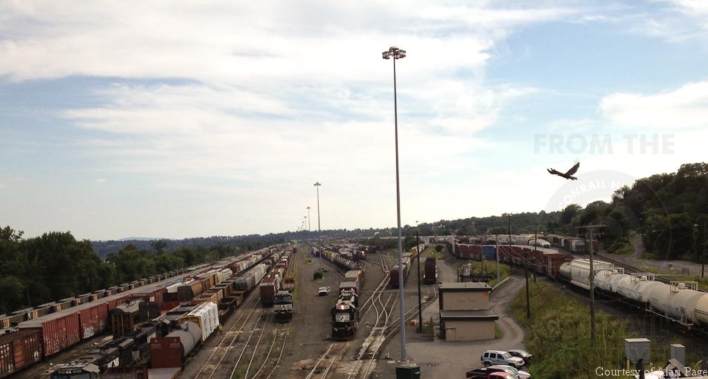 An overview of the Westbound classification yard at Enola shows NS SD40-2 3383 (CR 6449:2) and ex-SR GP38-2 5002 waiting with mixed freight on August 25, 2014.