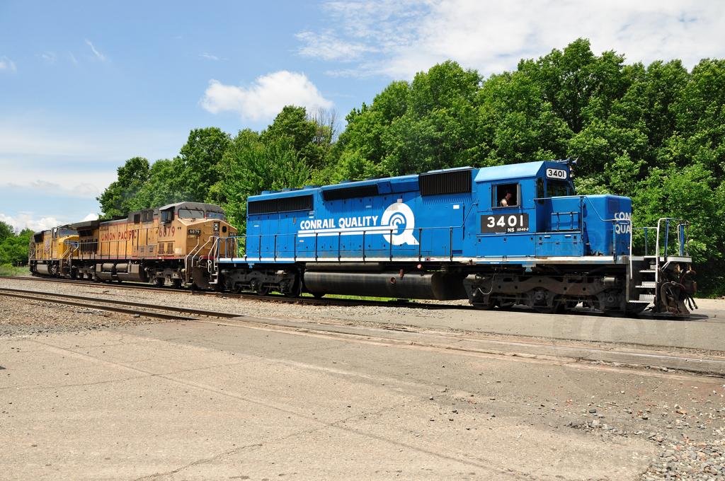 A veteran leader, with some western help, brings eastbund NS train 68Q (unit ethanol train) around the west leg of the wye at CP-PD, as she enters the Chemical Coast Secondary from the Port Reading Secondary.