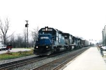 Former Conrail 6478 (NS 3403) and a mixed bag leads NS 14J thru Waterloo, IN on Nov. 25, 2001.