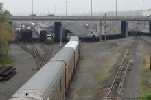 As NS 2772, 2750, and 5606 sort autoracks including CR TTGX 159496, ex-CR SD40-2 6976(NS 3433) awaits under I-81, and ex-CR C40-8W 6188(NS 8395) awaits to the right of the yard office.
