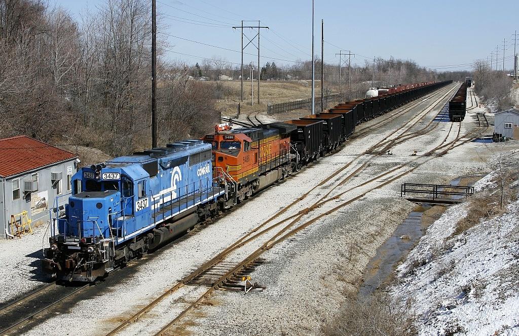 A former Conrail SD40-2R and a BNSF GE lead NS train 65Z out of Chrysler yard in Twinsburg, Ohio. Under that blue paint and NS patch is a one time Conrail celebrity, SD40 #6300, the savings bond unit. It started life as PRR 6047. This unit, like many of the -2R's, retained many "straight 40" features.