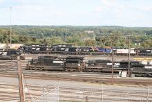 NS GP38-2 5297 (CR 8105) rests between GP38-2 5055 and "Honoring our Veterans" SD60E 6920 on August 24, 2014. Sandersville SW1500 1100 has come a long way from Sandersville, GA to join the NS fleet at Enola.