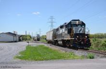 NS K22 local out of Northumberland Yard with NS 5323 GP38-2 on the east end arrives with one car for Nutrien Ag Solutions east of Strawberry Ridge, PA at M.P. 14, the end of the line on the Watsontown Industrial Track.