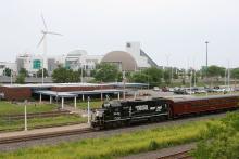 A view of the west end of our Operation Lifesaver train at the Amtrak station in Cleveland with the Great Lakes Science Center in the background. NS 5342 was CR 8181. It's on what's left of the ex NYC Lakefront Chicago Line, now just a single track. The Cleveland Line can just be seen in the foreground, and that's the Cleveland RTA under the wires.