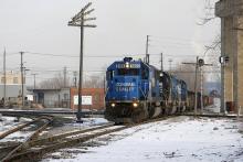 NS train BX01 is departing Campbell Rd yard (ex original Wheeling) for Rockport with blue bookends, SD50 5405 and SD40-2 3380. The sign off to the left is for the CSX Clark Ave yards, and the power is hitting the CSX CT&V Sub diamond and will soon hit the CL&W diamond just ahead.