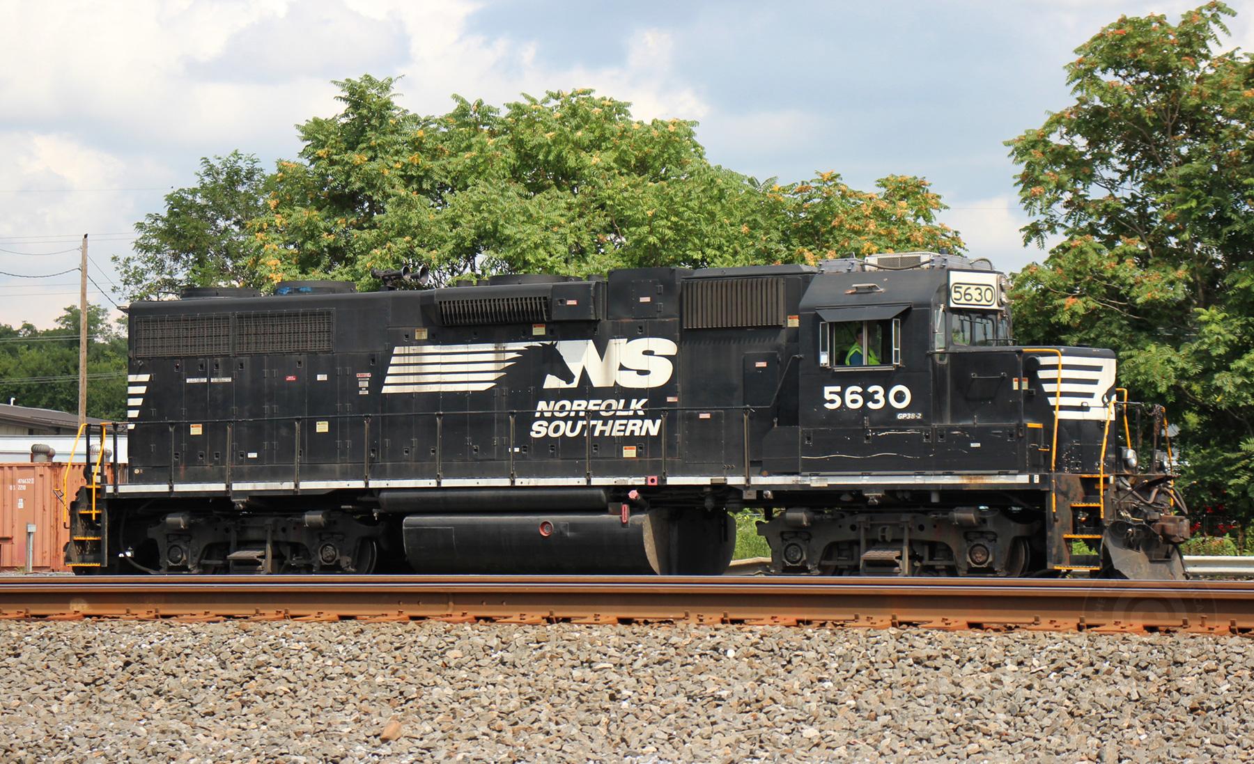 NS 5630 is seen at Lucknow, PA on 8/17/19. Unit is ex NS 2894/CR 7702/PC 7702 and was rebuilt by NS to a GP38-2 and was released from JBS in March of 2006.