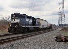 NS GP38-2 #5664 (PC #7736 GP38) at Bound Brook on ex Lehigh Valley trackage. Eastbound on February 18, 2013 EMD GP38-2; Built as Penn Central GP38 #7736; Serial number 7191-62; Order number 7191; Built July 1969; to CR #7736; became Norfolk Southern GP38 #2913, rebuilt to GP38-2 #5664 in Sept 2006.