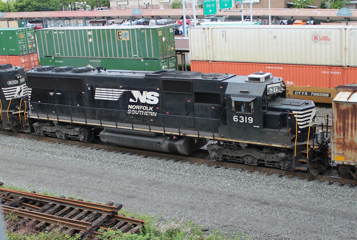 Former NS 5427/CR 6749 is seen on the rear of NS 64R at Altoona,PA on 6/13/14. Unit was rebuilt by NS to a SD40E and was released from JBS in Oct of 2009.