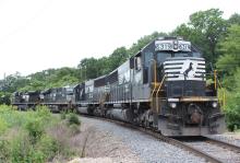 Former NS 5427/CR 6749, along with NS 6304, are seen along way from their Altoona, PA home at Westville, NJ on 6/4/15. Unit was rebuilt by NS to a SD40E and was released from JBS in Oct of 2009