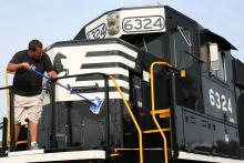 NS SD40E 6324, formerly the NS 5400, and originally Conrail's SD50 class unit, 6700 on 5-21-10 at Strasburg, PA for Conrail Days 2010. This unit hasn't even been out of the shop for a week, the smell of fresh paint is very much in the air and yet, somehow, Kevin & crew felt compelled to give her a bath.