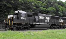 Former NS 5444/CR 6777 is seen on the rear on NS 20T on Horseshoe Curve at Altoona PA on 6/28/13. Unit was rebuilt by NS to a SD40E and was released from JBS in Jun of 2010.