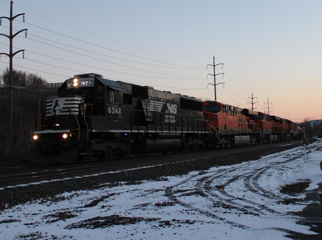 Former NS 5430/CR 6753 is seen leading three BNSF units west on NS 65K at Wyomissing, PA on 1/10/15.